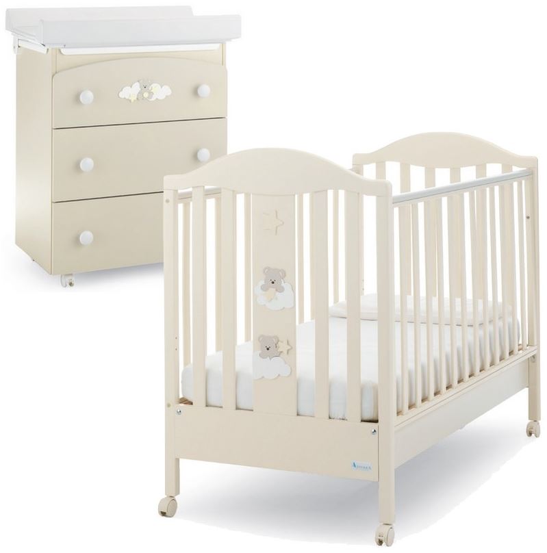 La cameretta Starlette ha dei simpatici orsetti con nuvole e stelline composta da:100% MADE IN ITALYLettino:- ampio cassettone per riporre tutto il necessario per il piccolo- 4 ruote piroettanti di cui due con freno- sponda regolabile in altezza- guaina antimorso sul bordo delle sponde- spigoli arrotondati- rete a doghe- vernice atossiche- kit doppia altezza inclusoBagnetto/Fasciatoio- 3 ampi cassetti- 4 ruote piroettanti di cui due con freno- ripiano fasciatoio con morbido materassino pvc munito di bordi anti caduta- vasca per il bagnetto- ripiano fasciatoio con apertura di sicurezza per evitare chiusure accidentali durante il bagnetto del piccolo- vernice atossica- Cordinato 4 stagioi ( piumone + paracolpi + federa)Materasso sfoderabile, antisoffoco, anallergico, ecc IN OMAGGIOMisure lettino: cm 71x130x106 hMisure bagnetto: cm 76x49x85 h