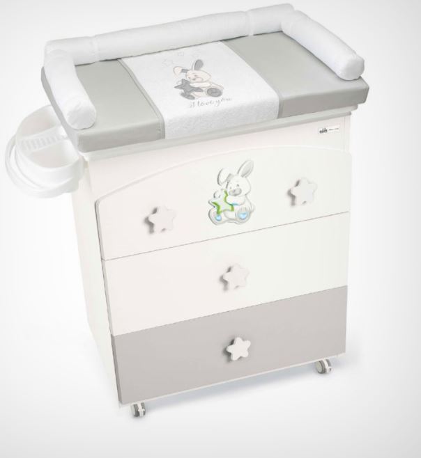 COPRI FASCIATOIO CONIGLIO GRIGIOPiano d’appoggio confortevole e funzionale per il bambino- Fasciatoio molto imbottito e realizzato in morbido tessuto, con parte centrale realizzata in spugna ricamata- Facile da fissare al piano del bagnetto- Accessori optional: Cassettiera