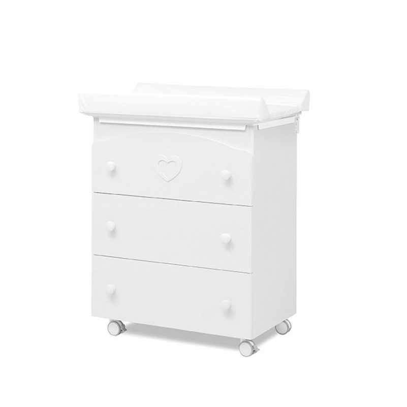 Cassettiera fasciatoio Dolce con struttura in truciolare certificato E1 a bassa emissione di formaldeide rivestito in PVC, dotata di vaschetta per il bagnetto anatomica e antiscivolo, maniglie in legno e 4 ruote di cui due con freno. Dimensioni: L81xP49xH100.5 cm.