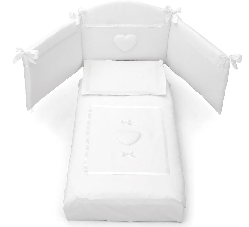 L COMPLETO LETTINO ERBESI UN COMPONENTE DEL COORDINATO DA LETTINO LINEA DOLCE.Il completo lettino Erbesi e un componente della nuova linea Dolce, creazione di Erbesi ditta leader nel mondo della prima infanzia, con i tessuti raffinati di ottima qualita utilizzati e le splendide decorazioni donano a questa linea un aria poetica e romantica pronta per far innamorare le mamme piu esigenti in cerca del meglio per il loro bambino.IL SET LETTINO ERBESI DOLCE RICAMATO COMPOSTO DA PIUMONE, PARACOLPI E FEDERA GUANCIALEIl set lettino Erbesi Dolce modello ricamato include un piumone sfilabile composto da una soffice imbottitura interna e il sacco in cotone sfilabile di ottima qualita che d’estate tolta l’imbottitura interna puo essere utilizzato come un fresco copriletto estivo, il paracolpi coordinato e un accessorio indispensabile per proteggere il tuo bambino e puo essere legato facilmente alle sponde del letto grazie a romantici fiocchetti bianchi e una fresca federa in cotone per guanciale.COMPLETO LETTINO ERBESI ADATTO AI LETTINI NEAONATI A SBARRE 0 – 4 ANNIIl completo da lettino Erbesi Dolce e adatto per tutti i modelli di lettini a sbarre 0 – 4 anni di dimensioni standard.LAVAGGIO CONSIGLIATO PER SET PARACOLPI DOLCE ERBESI: Si consiglia lavaggio 30 gradi, Non utilizzare candeggina e asciugatriceComposto da: Trapunta con imbottitura estraibile, Paracolpi e Federina