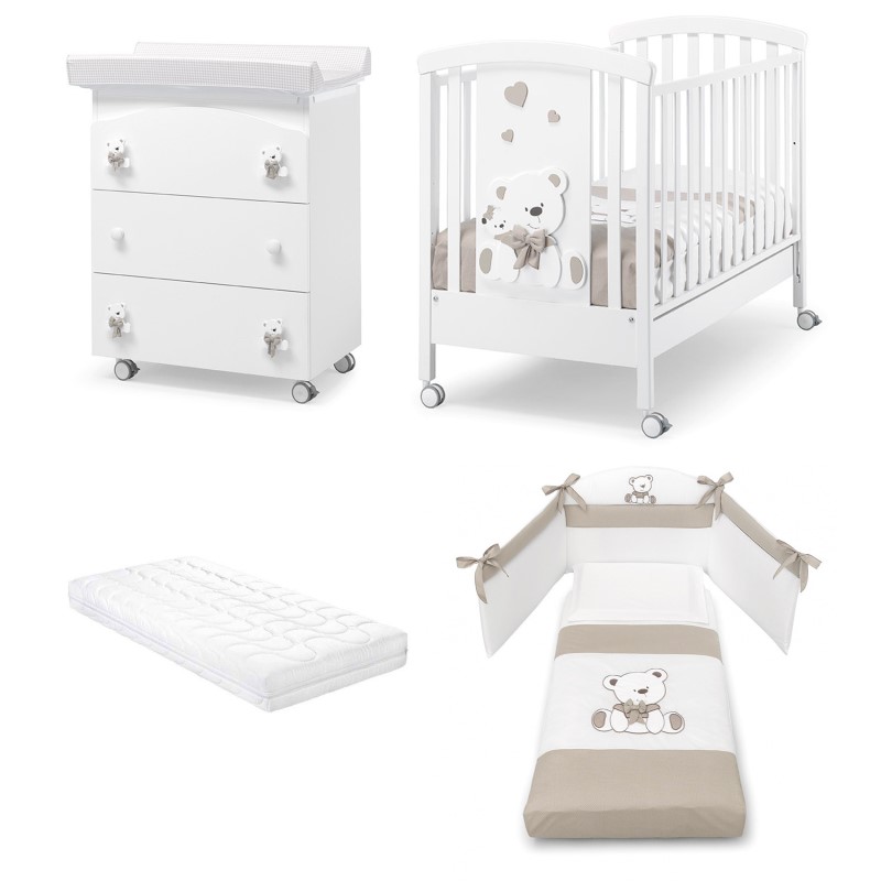 Offerta Cameretta Erbesi Tato e la soluzione ideale per arredare la camera del neonato con il personaggio di un tenero orsetto, impreziosito da un grazioso fiocchetto in tessuto al collo. L’offerta comprende:Lettino Erbesi TatoBagnetto Fasciatoio Erbesi TatoCompleto Piumone paracolpi Erbesi TatoMaterasso AntisoffocoLa collezione Erbesi Tato si caratterizza per un lettino con pannello centrale sul quale e posta un’applicazione in rilievo di un grande orsetto con un fiocco al collo in tessuto. Anche il bagnetto fasciatoio riporta le stesse applicazioni sul primo e terzo cassetto. Il completo piumone e paracolpi riprende lo stesso orsetto ricamato sui tessuti. Gli arredi Erbesi sono realizzati con ottimi e pregiati materiali per durare nel tempo e arredare la camera con eleganza e stile.Il lettino Tato di Erbesi ha un comodo cassetto per riporre tutto il necessario del bambino, quattro ruote per facilitare gli spostamenti e sponde laterali regolabili in altezza. Il lettino ha inoltre una rete in faggio posizionabile in due diverse altezze.Dettagli prodottoLettino Erbesi TatoStruttura in legno di faggioApplicazione in rilievo con stampa serigraficaVernici atossicheKit doppia altezza incluso.Dotato di cassetto.Sponde regolabili in altezza.4 ruote piroettanti di cui due frenanti.Decorazioni in legno.Sponde laterali regolabiliDimensione Lettino Erbesi Tato135 x 71 x 104 (h) cmBagnetto Fasciatoio Erbesi Tato4 ruote piroettanti, 2 con blocco di sicurezza3 cassetti scorrevoliPiano fasciatoio morbido a 2 lati inclusoRipiano alto sollevabile per inserire facilmente e in tutta sicurezza il bimbo nella vaschettaVaschetta anatomicaDimensioni Fasciatoio Erbesi Tato:81 x 48 x 100,5 (h) cmCompleto Piumone paracolpi Erbesi TatoComposto da federa cuscino, piumone sfilabile e paracolpi laterale.Decorazioni ricamate.Tessuto 100% cotone.Materasso Antisoffoco incluso nell’offerta.