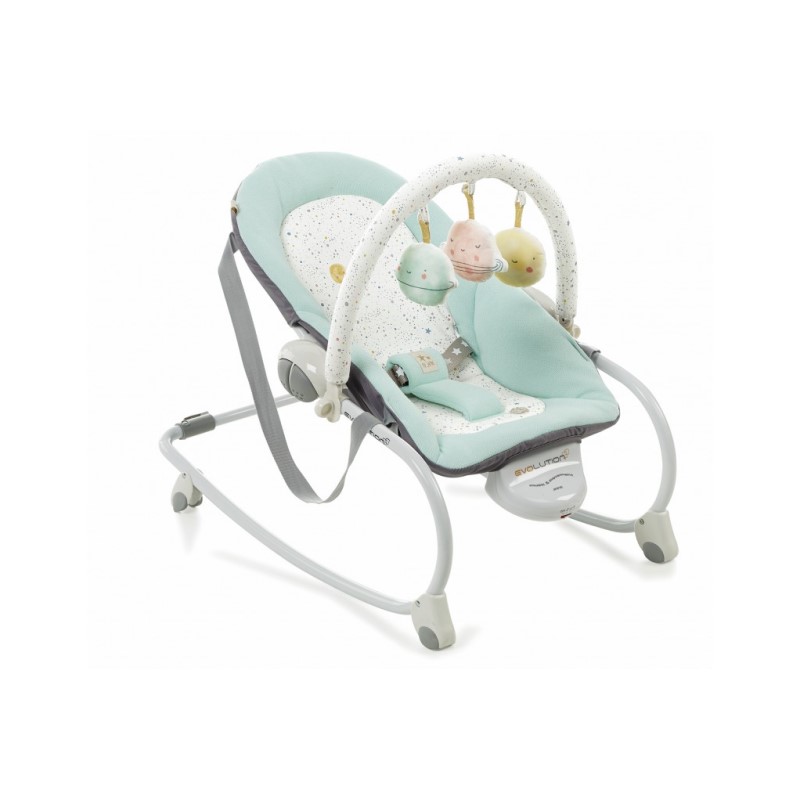 EvolutionSedia a dondolo trasformabile in seggiolinoSedia a dondolo trasformabile in sediolina fino ai 3 anni. Comprende una nuova imbottitura nella zona dei piedi che, insieme alle melodie e alla vibrazione della sedia a dondolo, rilassa il tuo bambino.