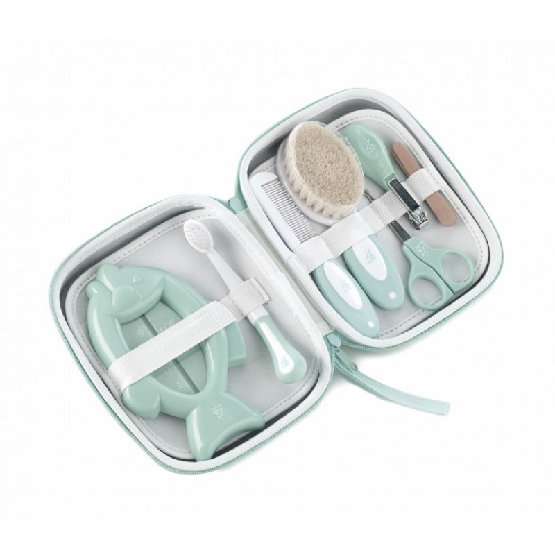 Kit igiene per bambiniAstuccio che comprende 1 spazzola di setole naturali, 1 pettine, 1 spazzolino da denti, 1 paio di forbici di sicurezza, 1 tagliaunghie, 4 limette per unghie e 1 termometro per misurare la temperatura dellacqua. Il set piu completo per ligiene del tuo bambino!Colore: MintReferenza 040218 U13