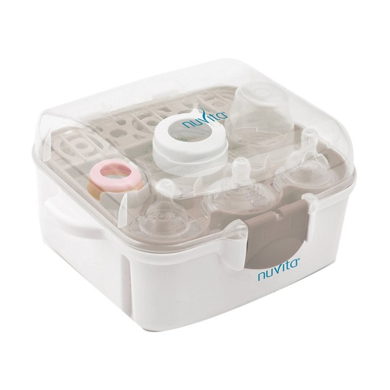 Lo sterilizzatore per forno a microonde Nuvita e compatto e leggero e la soluzione ideale per una sterilizzazione efficace e veloce quando sei a casa o in vacanza. Puo sterilizzare fino a 3 biberon a collo largo ed accessori in un solo ciclo, eliminando il 99,9% di germi e batteri in pochi minuti. La sterilizzazione a vapore elimina i germi grazie alla temperatura elevata dellacqua e alla forza igienizzante del vapore senza utilizzare prodotti chimici. Ha manici anti-scottature e chiusura a clip laterali per una maggior sicurezza durante luso. Se il coperchio non viene sollevato, il contenuto rimane sterile per 24 ore.